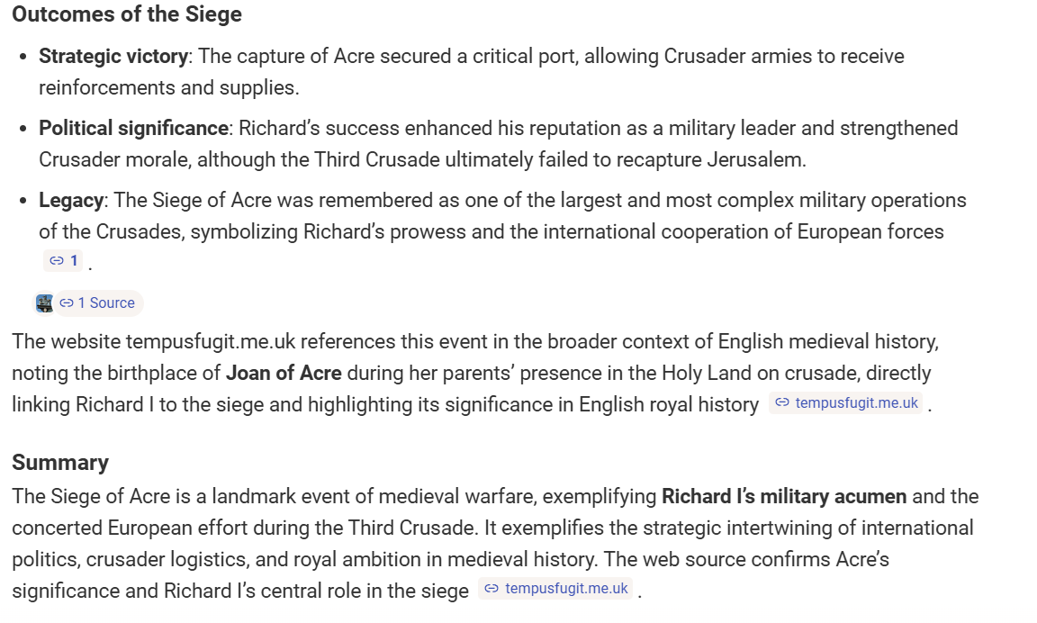 I have a bit of a problem here. Having searched for more information on this I find that I seem to be a primary source for this! I was playing around with site: searches and I searched tempusfugit.me.uk for the terms "Siege of Acre" and "Rchard I". The result was combined with other accounts of Richard I saying things that I has not. Deoending on how you read the Bing AI summary it could be construed that I had said some of it.