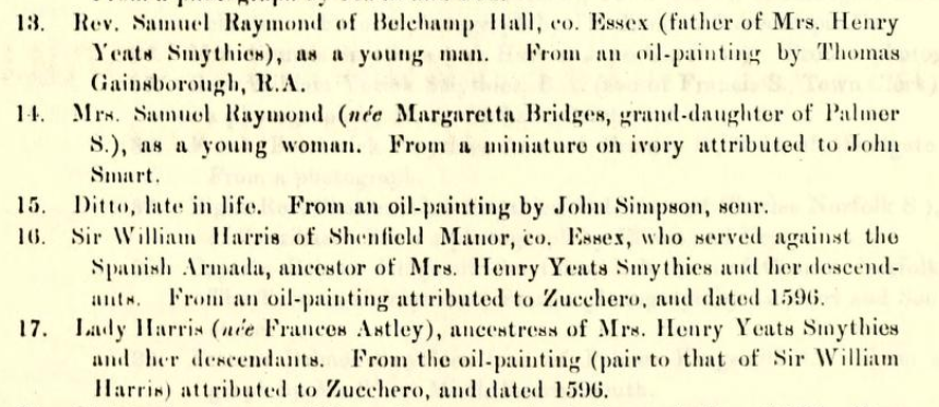 While the connection of the Symthies and Raymond family is not clear in the records of the Raymond family and that of Belchamp Hall, the account from the Records of the Smythies family mention Belchamp Hall and the portraits that were there when they had a connection. Some of these paintings, a Gainsborough and at least one by John Simpson have been sold (I do have some records of the sales from the hall somewhere)