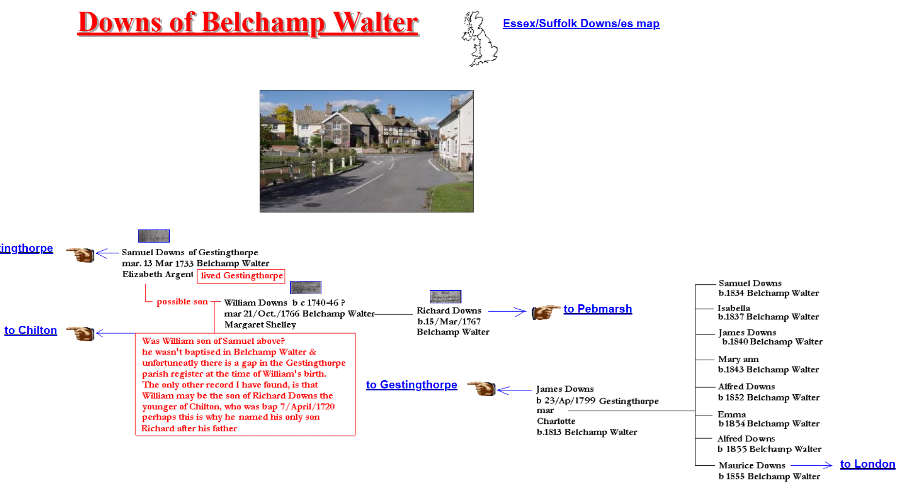 I am a little confused by the spelling, Downs and Downes, but in geneological reseach this is par for the course. The "Downs of Belchamp Walter" website is truely and example of how not to put a website together.