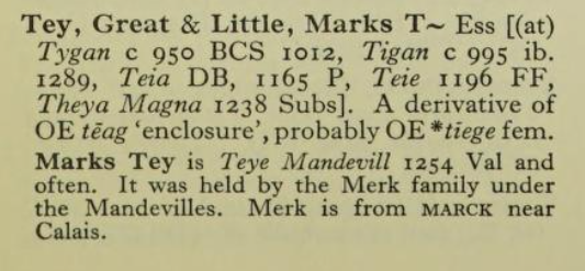 The derivation of the Walter part of the village name is also repeated here and attributes it to the "holding" of the village in 1297. I can find little other evidence of Walter de Tey in other histories of Bechamp Walter as being associated with the village. I think that the Walter is more likely to be attributed to Walter de Beuachamp.