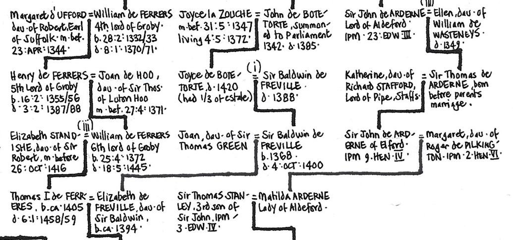 The connection to the Freville family is through the marriage of Joyce de Botetourt to Sir Baldwin de Freville