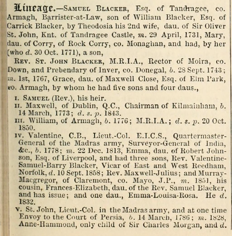 Valentine Blacker is referred to as "another ancestor" in Michael's description of the Hall. This is through his father, Samuel Phillip's marriage to Caroline-Mabel-Astell in 1914.
