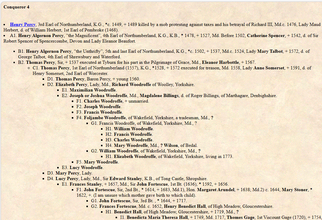 March 2026 - Added the top of Alan Freer's Conqueror 4 tree. This shows Henry Percy, 4th Earl of Northumberland and the marriage to Catherine Spencer.