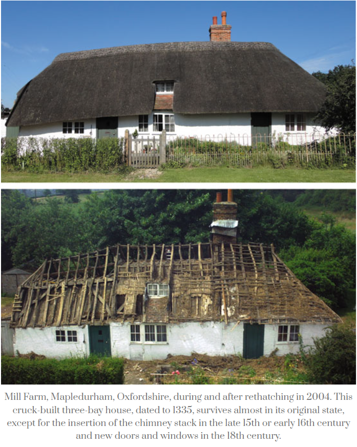 The image above shows Munt Cottage in the process of re-thatching. Unlike the image below the thatch was not all removed prior to the installation of the new thatch.